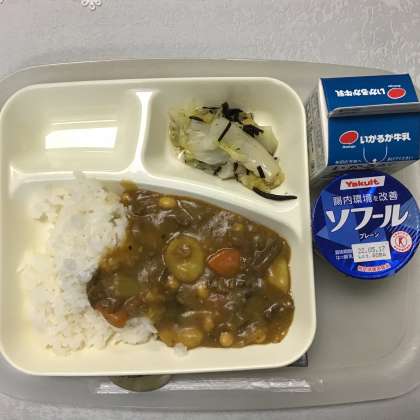 牛肉と大豆のカレーライス キャベツのひじきドレッシング ヨーグルト 牛乳
