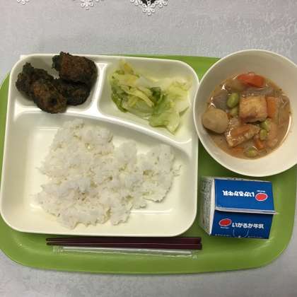 竹輪の磯辺揚げ 厚揚げと里芋の味噌煮 あっさりキャベツ ごはん 牛乳