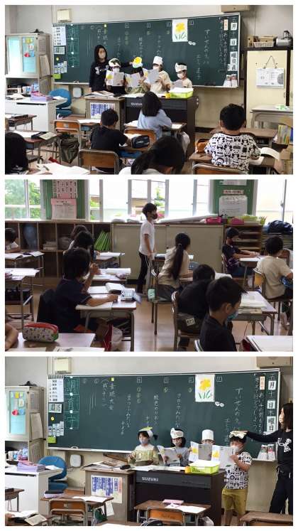 4人ずつのグループですいせんやカエルなどの役を決めて読んでいました。聞いている児童は、しっかりとその感想を発表していました。