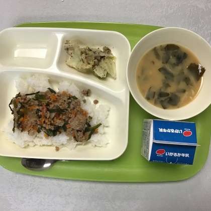豚ひき肉とにらのそぼろ丼 みそ汁 キャベツの赤じそあえ 牛乳