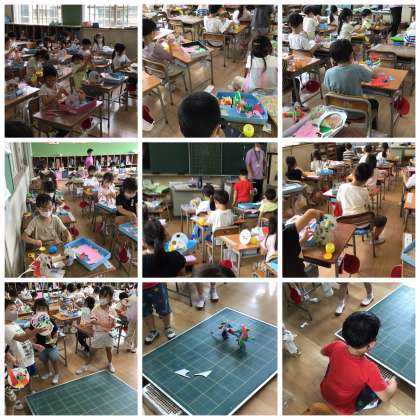 6月20日(月)、1年生が図画工作の時間に「紙皿コロコロ」を作っていました。