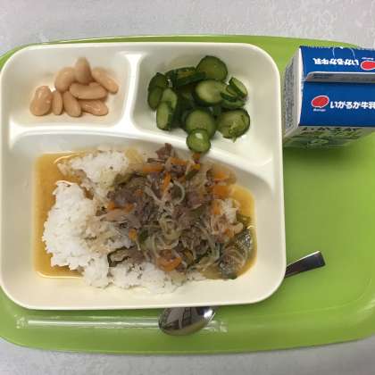 牛丼 きゅうりのしょうが漬け 大福豆の煮物 牛乳