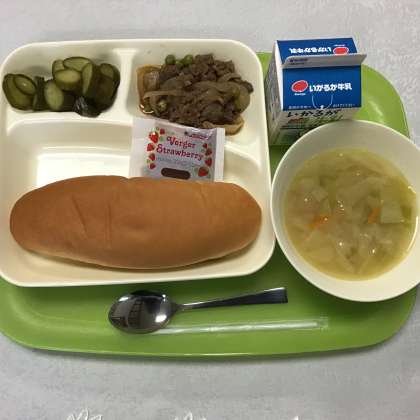 牛肉のデミグラスソース煮 スープ きゅうりのピクルス コッペパン・いちごジャム 牛乳