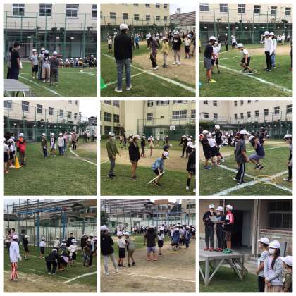運動場に4つの縦割りが一列に並び、約45人が頭から足へフラフープをくぐっていきました。最初は要領がつかめなかった子どもたちも、2ゲーム目は互いのスピードを競っていました!!