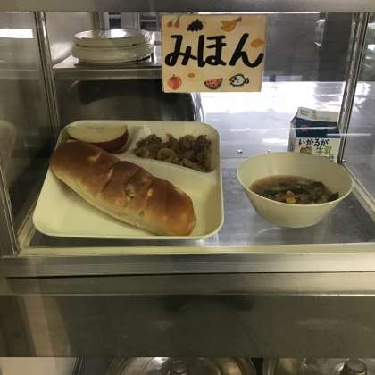 豚肉のオイスターソース焼き 中華みそスープ りんご おさつパン 牛乳
