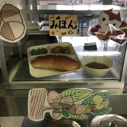白身魚フリッター ミネストローネ ブロッコリーのサラダ レーズンパン 牛乳