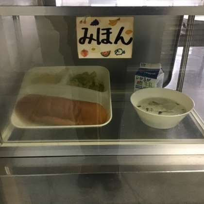 ほうれん草のクリームシチュー キャベツのサラダ 洋梨(カット缶) 黒糖パン 牛乳