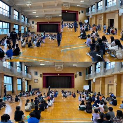 黄、青、緑、橙の4色各6チームのメンバーの顔合わせができました。担当のH先生から、縦割り班活動の説明を聞く時は、みんなしっかり前を向いて聞いていました。