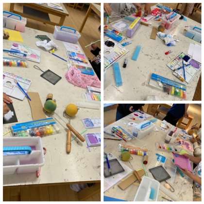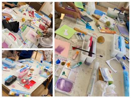 図工室では、絵の具と、歯ブラシ、金網、ビー玉、画用紙を切り抜いた型紙などを使って、選んだ色画用紙に色をつけていました。使う道具で、色のつき方もさまざま。色付けした紙を使って、何ができるのかな?