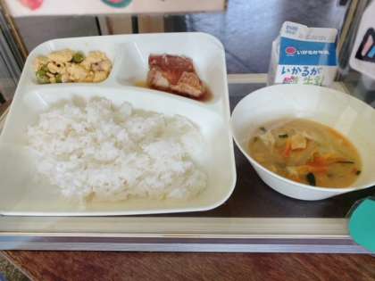 あかうおのしょうゆだれかけ みそ汁 えんどうの卵とじ