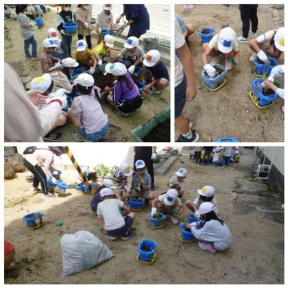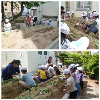 先週、草抜きをして整えてもらった学習園には、管理作業員さんが付けてくれたしるしのところにさつまいもの苗を1本1本丁寧に置いて植えました。