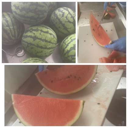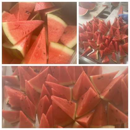 まず半分に、そのまた半分に、半分に切っていき、8等分にします。それを今度は大きさ,形が同じになるように8つに切ると、丸1個のスイカが64切れに。