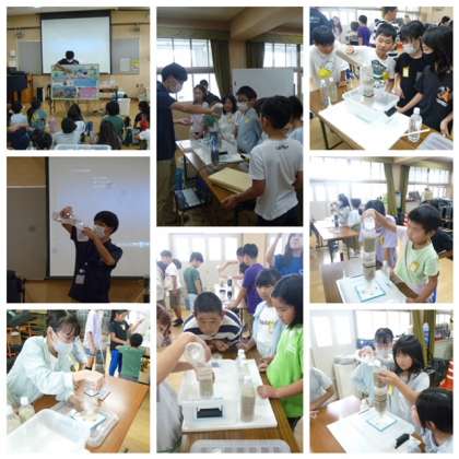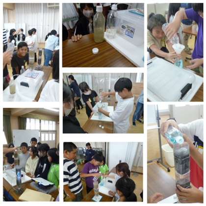オゾンや砂、粒状活性炭を使った実験装置に持って来てくれた淀川の水を通すと、あら、不思議。濁っていた水が透明になり、においも消えてしまいました。