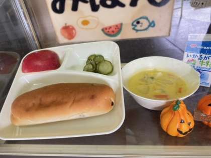 豆乳コーンクリームシチュー(米粉) きゅうりのバジル風味サラダ りんご