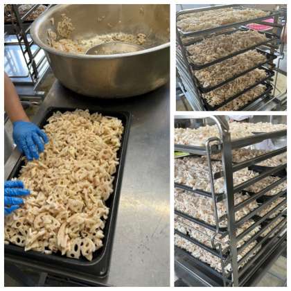 水にさらしてアクを抜いたれんこんを塩、綿実油で下味をつけます。網なしホテルパンに並べ、蒸し焼きモードでじっくり焼き上げると、美味しい焼きれんこんのできあがり。