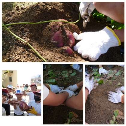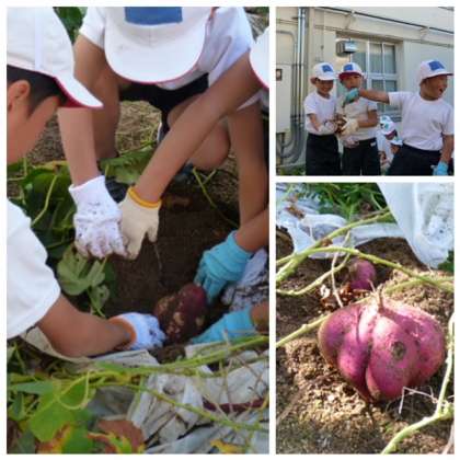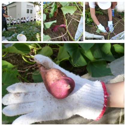 2時間目、春に植えたサツマイモをみんなで掘りました。長いつるをたどって、土を掘ると、赤紫色が見えました。かぼちゃのようにまるい形のいもや、とても大きないももあって、みんな大喜び。