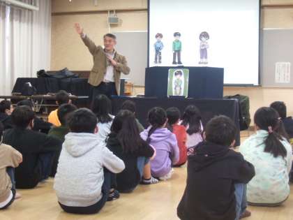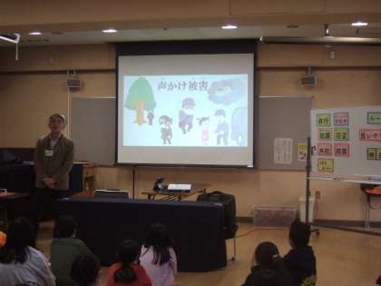 喫煙(薬物)、万引き、暴力、夜遊び(深夜徘徊)等、ルールを守れないことで、犯罪となったり(特に万引き)、巻き込まれたりして、家族や親しい人たちを悲しませることになります。加えて、逆に自分たちが犯罪被害にあわないよう心がけることを、スライドやペープサート(紙人形劇)を使って分かりやすく教えていただきました。