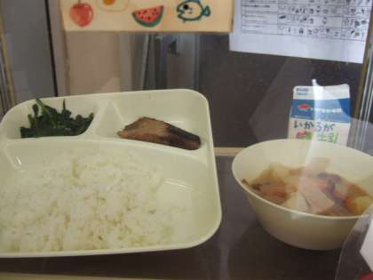 なまりぶしのしょうが煮 なめこのみそ汁 ほうれんそうのごまあえ ごはん、牛乳