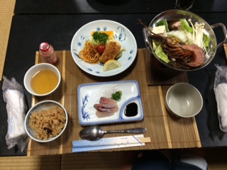 宿舎に着きました。避難訓練を終え、お待ちかねの夕食タイム。たこ飯、カンパチの刺身、そして伊勢海老♪いっただきまーす。