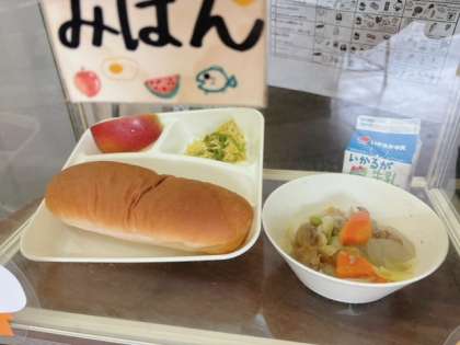 豚肉と野菜のスープ煮 カレーソテー りんご 黒糖パン、牛乳