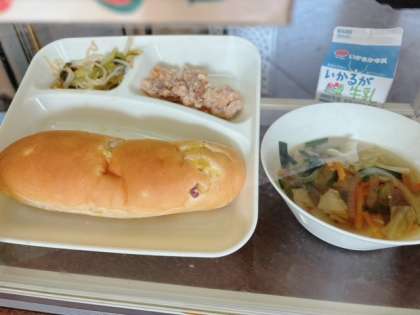 鶏肉のからあげ 中華スープ チンゲンサイともやしの甘酢あえ おさつパン、牛乳