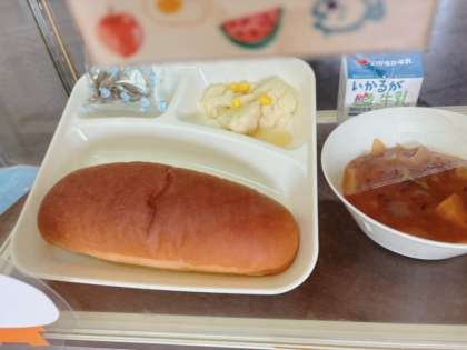 ビーフシチュー カリフラワーとコーンのサラダ ミニフィッシュ 黒糖パン、牛乳