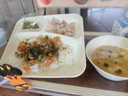 鶏ごぼうご飯 みそ汁 焼きれんこん 牛乳