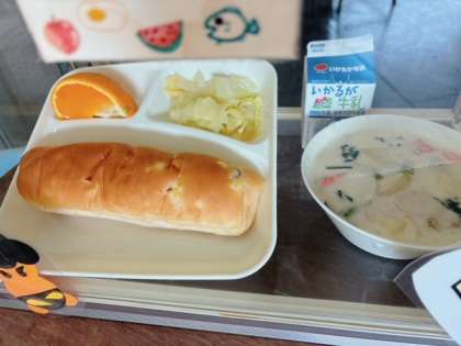 ほうれん草のクリームシチュー キャベツのサラダ デコポン おさつパン、牛乳