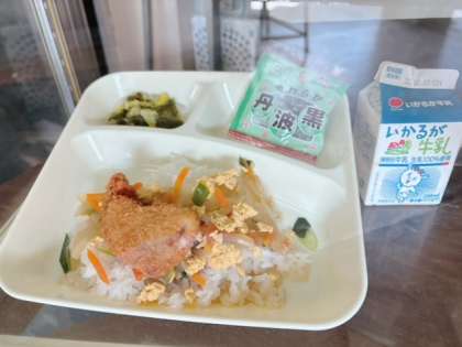 カツ丼 白菜の甘酢あえ ソフト黒豆 牛乳