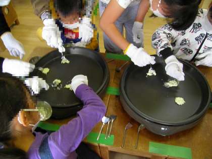 大阪名物お好み焼きを焼いているところ?いえいえ、これも食品サンプルです。本当にお好み焼きを焼く要領で作ります。ひっくり返したら、ソースをぬって、あおのりも、、、おいしそうに焼けました。毎日こんなお仕事なら、楽しそう!と思いますが、たいへんなことってあるのかな?ちなみに、今はおせち料理のサンプルづくりに大忙しだそうです。お世話いただいたみなさま、ありがとうございました!
