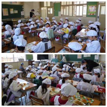 給食の時間、1年生の教室では、みんな ちゃんとエプロン、帽子を身につけて