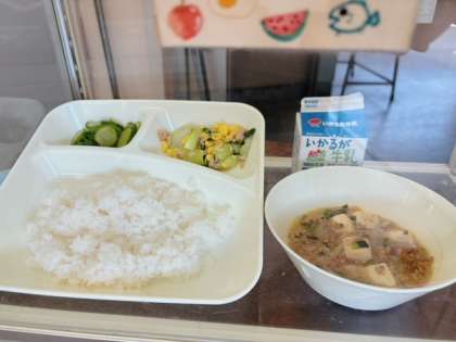 マーボーどうふ きゅうりの中華あえ ツナとチンゲンサイの炒めもの ごはん、牛乳