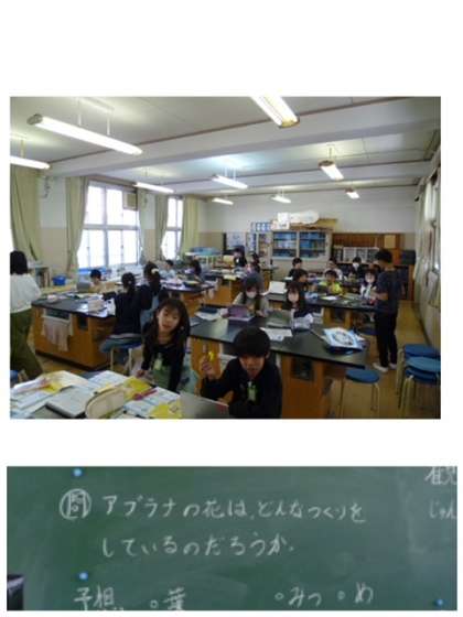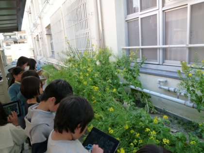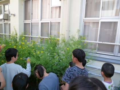 菜の花のつくりを調べる理科の時間、5年生は保健室裏に集まっています!?