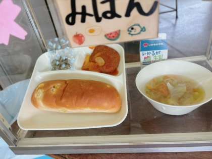 煮込みハンバーグ 野菜スープ ミニフィッシュ おさつパン、牛乳