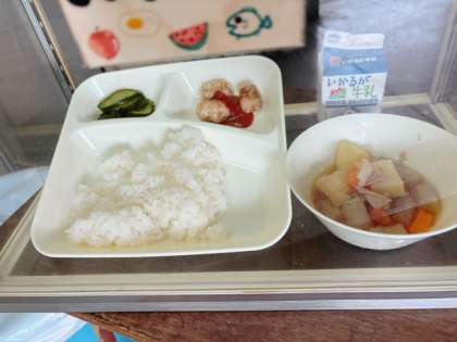 まぐろのオーロラ煮 豚肉と野菜の煮もの きゅうりの赤じそあえ