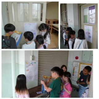 学校の中にあるいろいろな教室を2年生が1年生を連れて案内しています。部屋の前に貼られたクイズを解きながら、回っていました。
