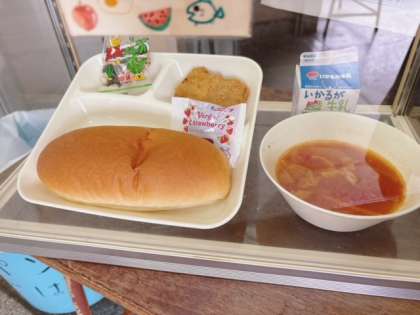 一口トンカツ ミネストローネ 豆こんぶ コッペパン、いちごジャム、牛乳