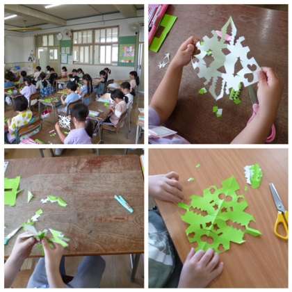 おりがみの端と端を合わせて2回折り、はさみで四角や丸、ハートなど好きな形を切り抜き、広げてみると・・・