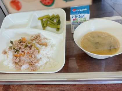 豚ひき肉とにらのそぼろ丼 じゃがいものみそ汁 さんどまめのごまあえ ごはん、牛乳