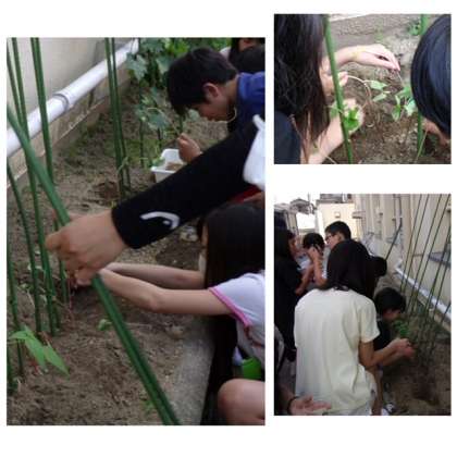 室内に置いていたインゲン豆を学習園に植え替えました。日かげから日なたに変わって、どうなるでしょうか?