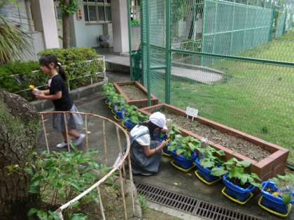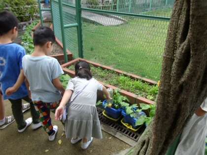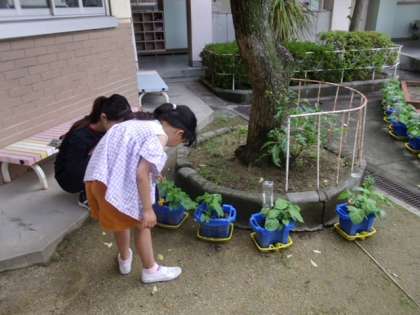 休み時間、1年生がアサガオの水やりに来ています。葉っぱが大きくなって、つるも伸びてきました。