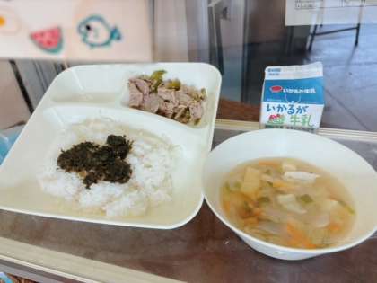 豚肉の梅風味焼き 五目汁 のりの佃煮 ごはん、牛乳