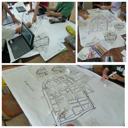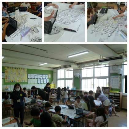 校区たんけんで調べたことを大きな地図に書いて、「わたしたちの町」を作成中です。