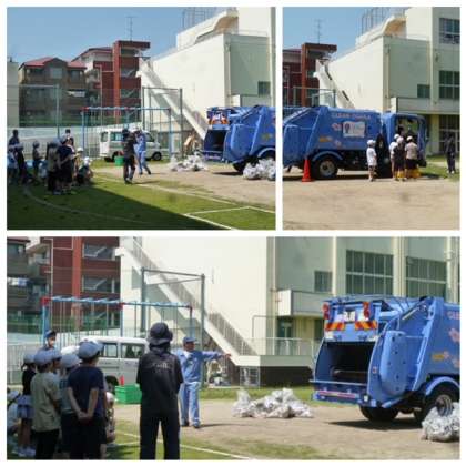 環境局から、ごみ収集車とともに職員の方が来られて、出前授業をしてくれました。