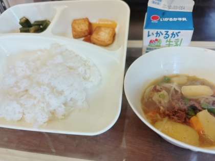 肉じゃが 厚揚げのみそだれかけ オクラのおかか炒め ごはん、牛乳