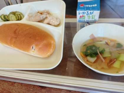 鶏肉の唐揚げ ハムと春雨のスープ きゅうりの中華あえ おさつパン、牛乳
