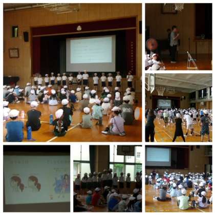 PTAや保護者の方もたくさん来てくださって見守るなか、保健体育委員による『N小学校の校長先生の悩み』解決に取り組んだビデオがわかりやすく、新たな遠里小野オリジナルのストレッチ「オリトレ4」も披露されました。