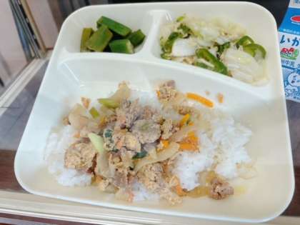 他人丼 ささみと野菜の炒めもの オクラの甘酢あえ ごはん、牛乳