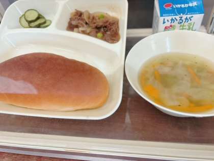 牛肉のソース煮 スープ きゅうりのピクルス 黒糖パン、牛乳