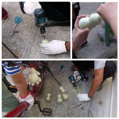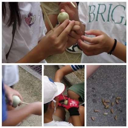 ひょうたんの口に穴を開けてもらい、割り箸で中を突いて種を取り出しました。